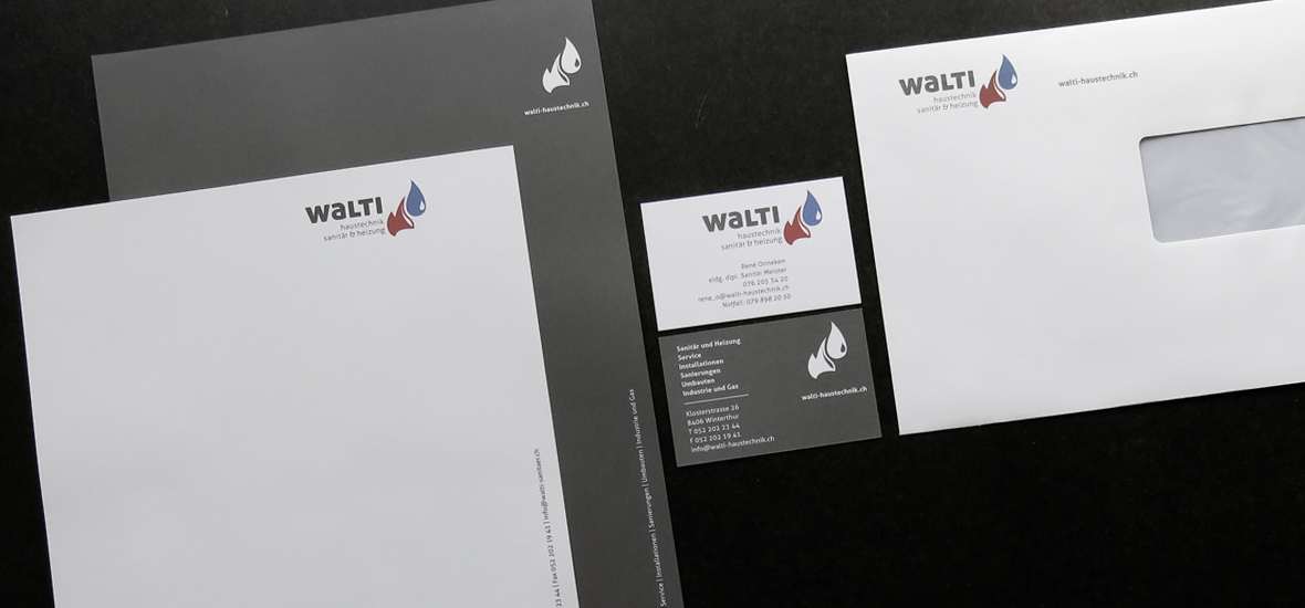 Im Zuge des Generationenwechsels erhielt Walti Haustechnik ein neues Gesicht – modern, klar und selbstbewusst. Das neue Erscheinungsbild fand nicht nur auf Briefpapier und Geschäftsdrucksachen seinen Platz, sondern wurde auch auf die Fahrzeugflotte übertragen. Gestaltung und Umsetzung der Beschriftung? Natürlich von uns – sichtbar stark, vom Papier bis zur Strasse.