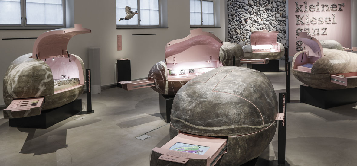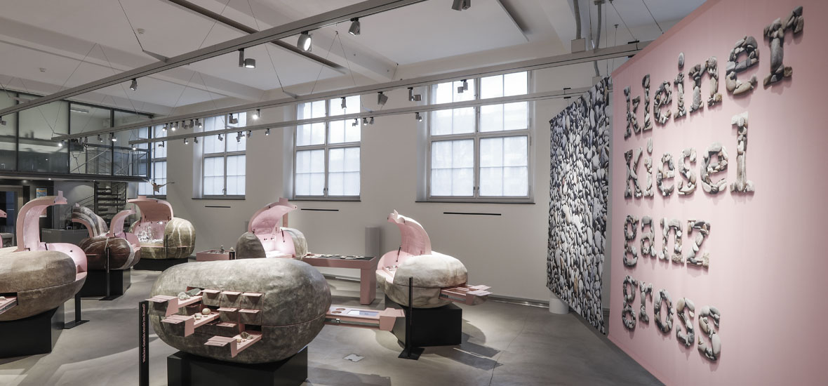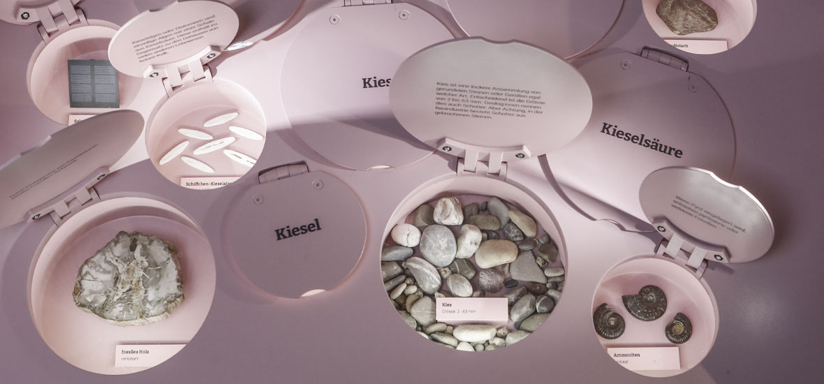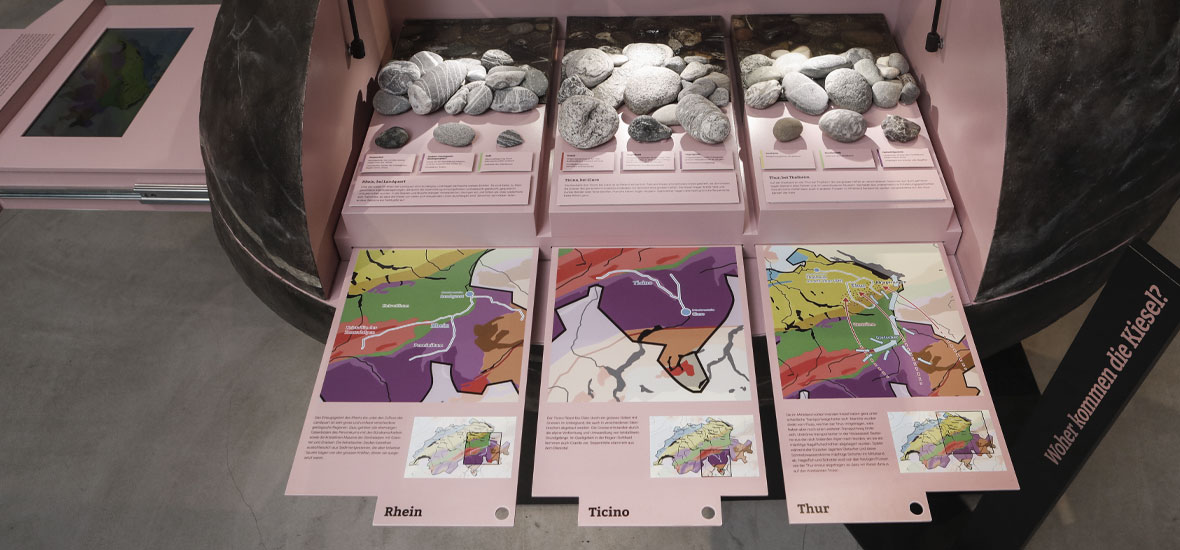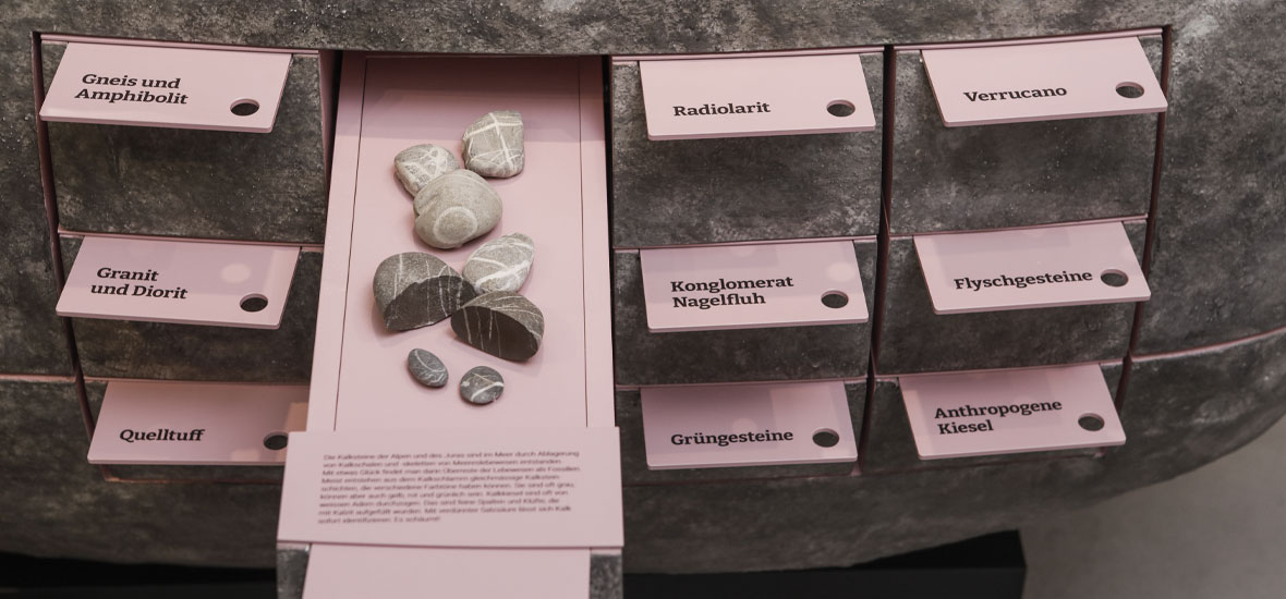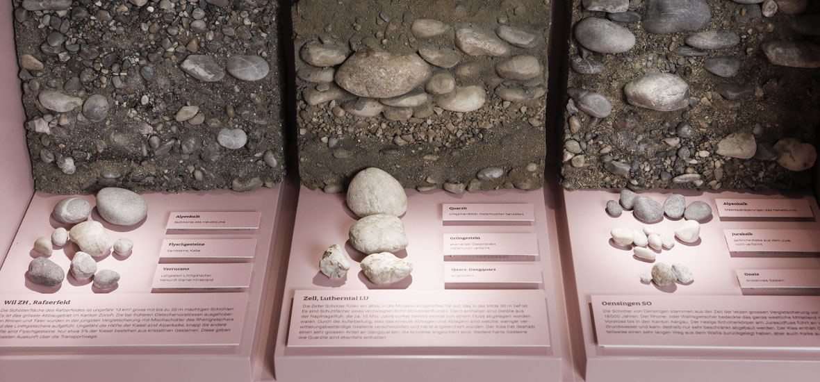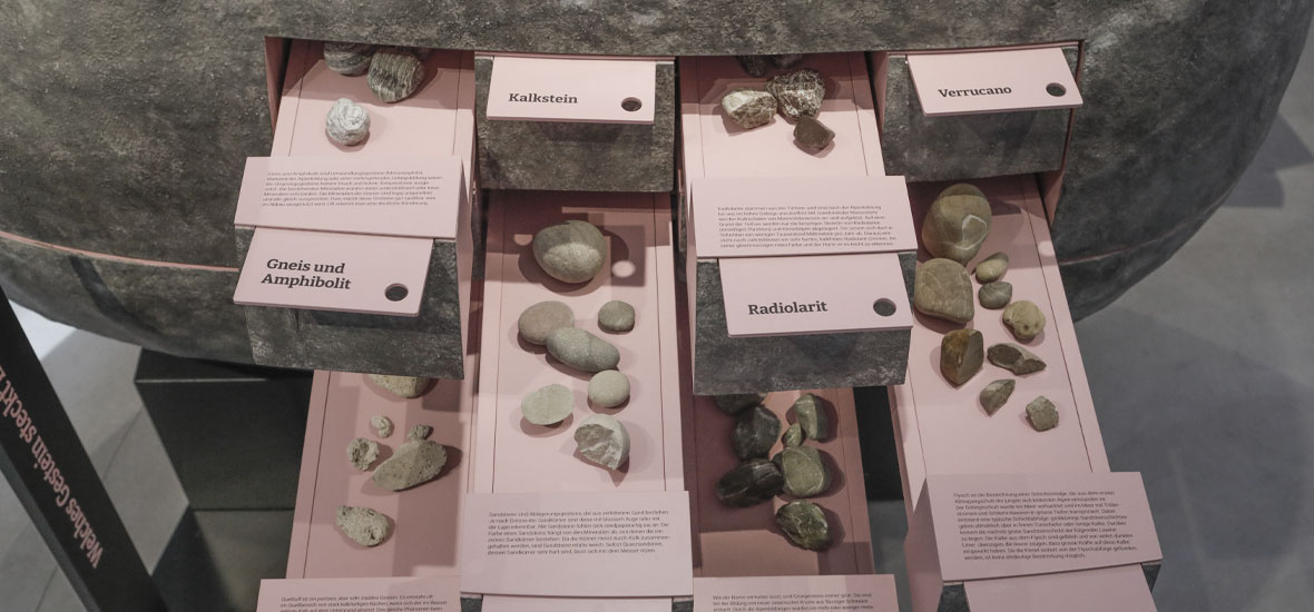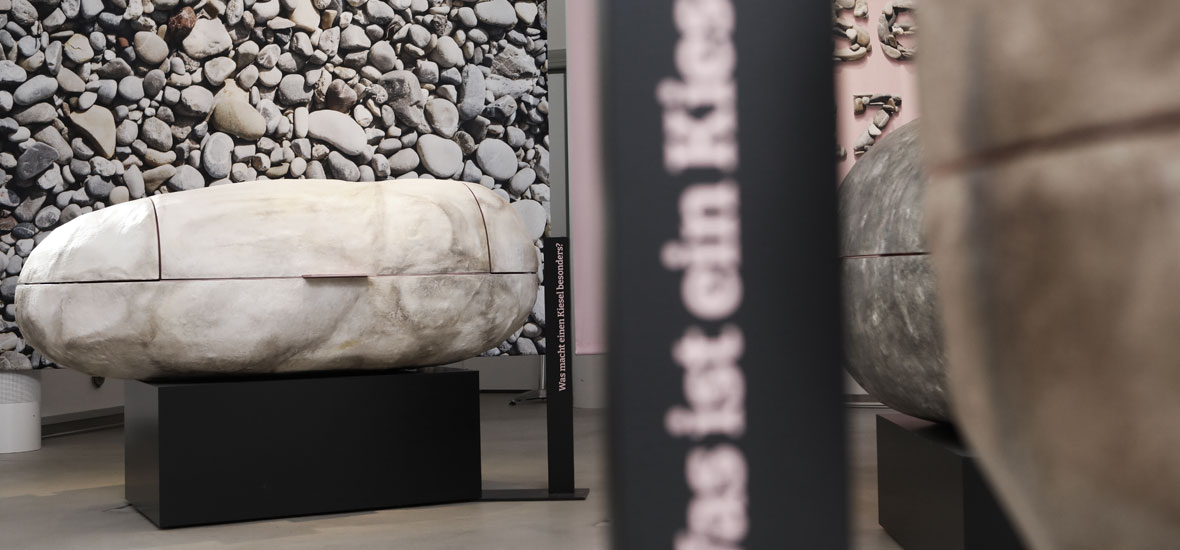 Kieselsteinen begegnen wir alle täglich, sei es auf Wanderungen in der Natur oder Spaziergängen in der Stadt. Wir alle haben schon einmal einen Kieselstein aufgehoben, der durch seine spezielle Form, Farbe oder Struktur aufgefallen ist. Vielleicht haben wir ihn sogar nach Hause getragen und als Dekoration oder zur Erinnerung an ein schönes Erlebnis auf das Fensterbrett gelegt. Zahlreiche spannende und faszinierende Geschichten sind in Kieselsteinen enthalten, doch bleiben diese für die meisten leider verborgen. Die neue Wechselausstellung «kleiner Kiesel ganz gross» lädt dazu ein, die in den Kieselsteinen verborgenen Geschichten zu entdecken. Durch die Kieselsteine erhält auch ein bisher geologisch weniger interessiertes Publikum den Zugang zu erdwissenschaftlichen Themen. Kieselsteine sind für alle zugänglich, einfach zu sammeln und überraschend vielfältig.