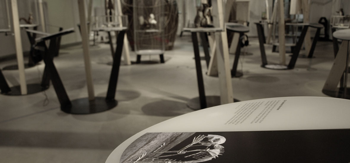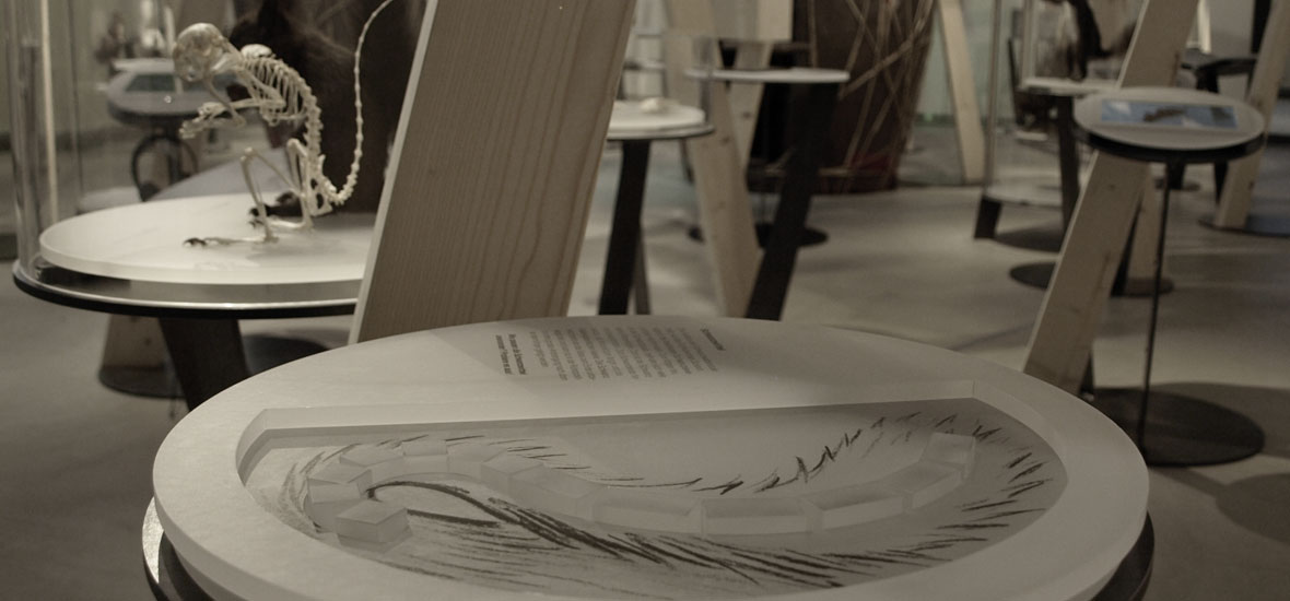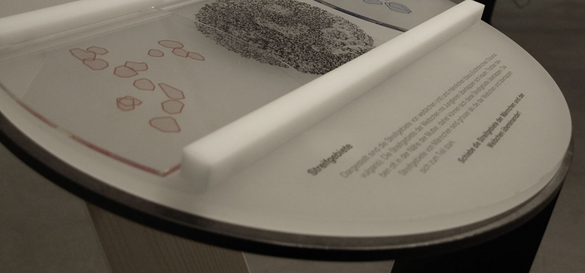 Die gelieferten Informationstexte wurden auf matte, transparente Folie gedruckt und auf diverse runde Plexigläser kaschiert. Anschliessend schnitten wir die etwas grösser produzierten Folien präzise auf das finale Mass zu. Das Ergebnis: eine edle, schlichte Umsetzung, die sich nahtlos in die luftige Ausstellungsgestaltung einfügt.